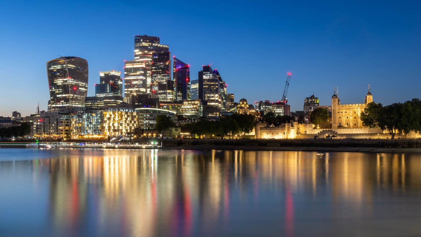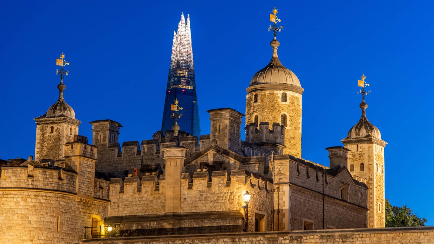The Tower of London at dusk with the Shard in the background.