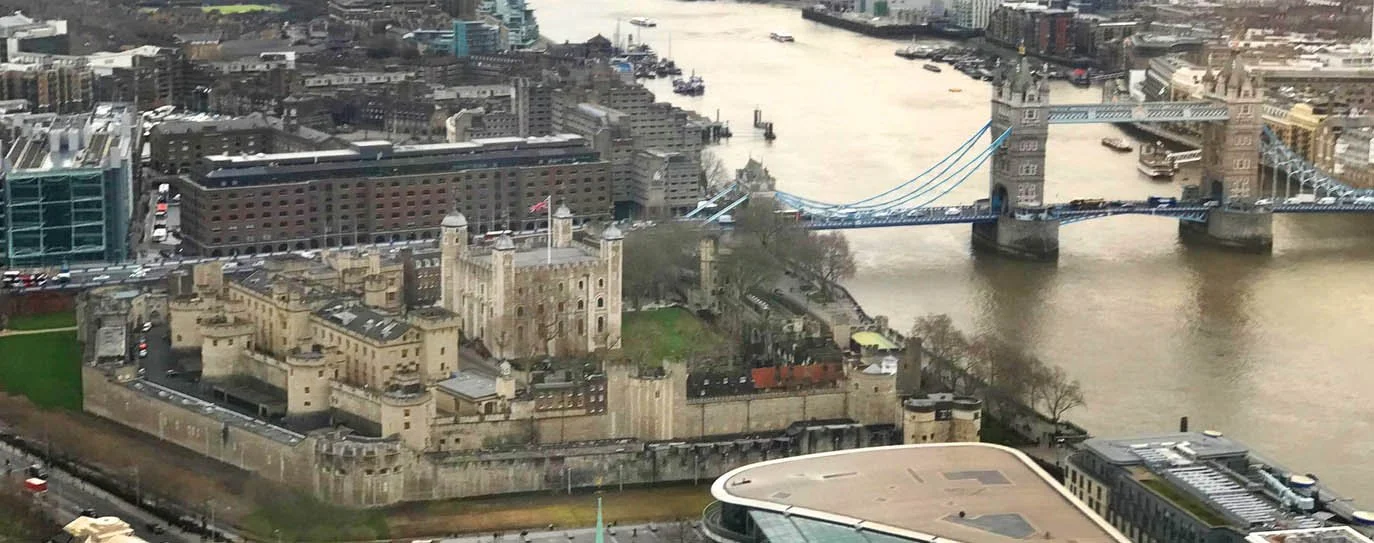 View of the Tower of London from atop the nearby Sky Garden.