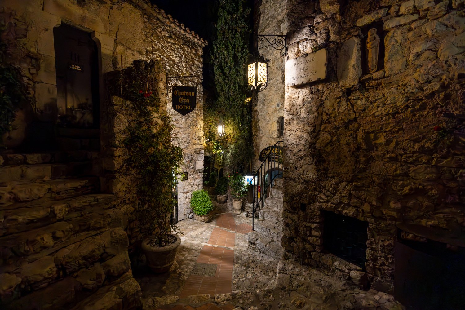 During the day the narrow streets of the French Riviera cliffside town of Eze are crowded with visitors. At night the Eze visitors have all left and the streets are mostly deserted.