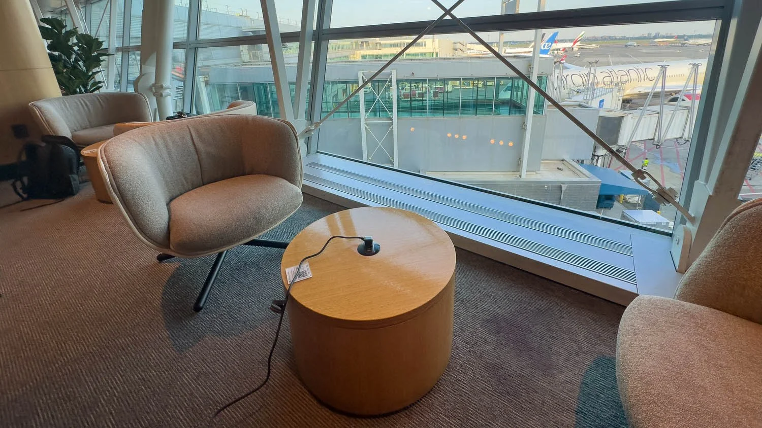 We enjoyed these comfortable chairs. While some gates are a long walk from the lounge, that’s our Virgin Airlines flight right outside the window.