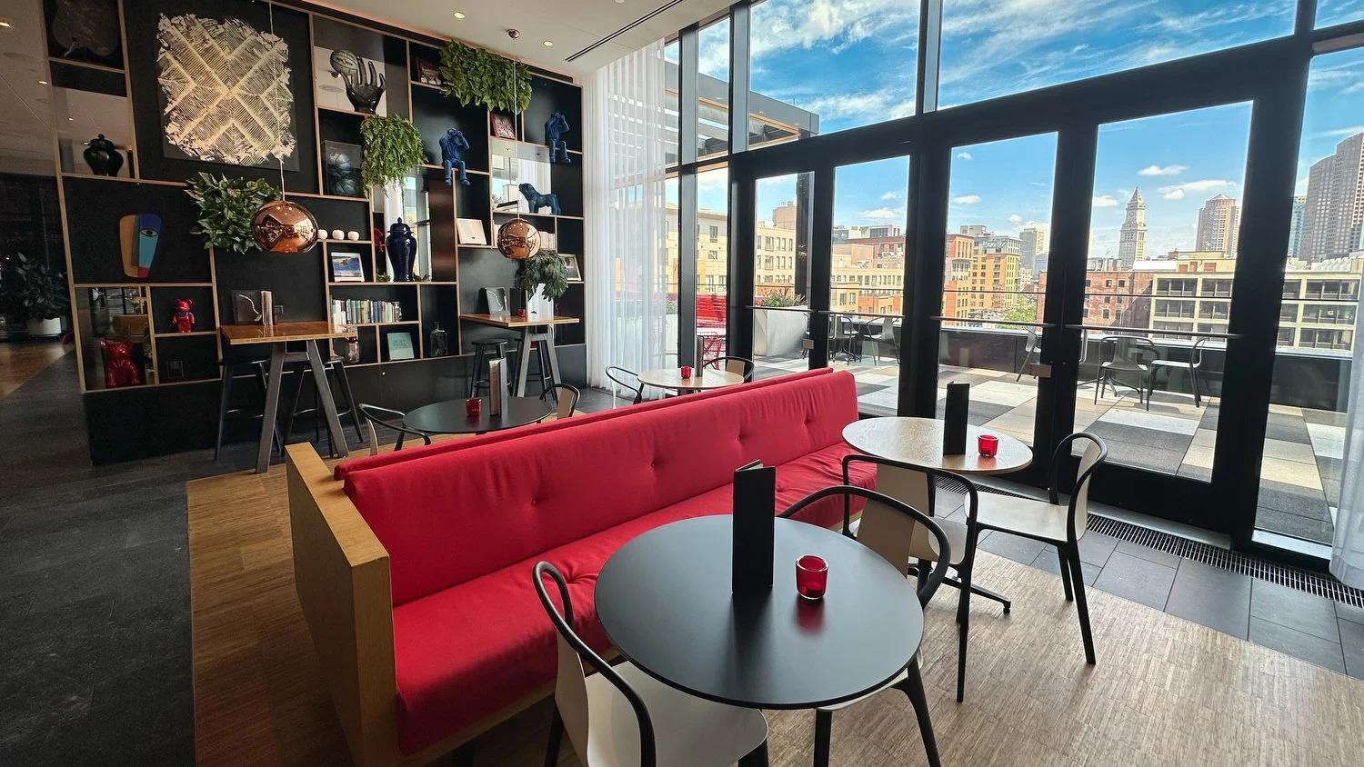 View of downtown Boston from the lobby terrace of the CitizenM Boston North Station Hotel.