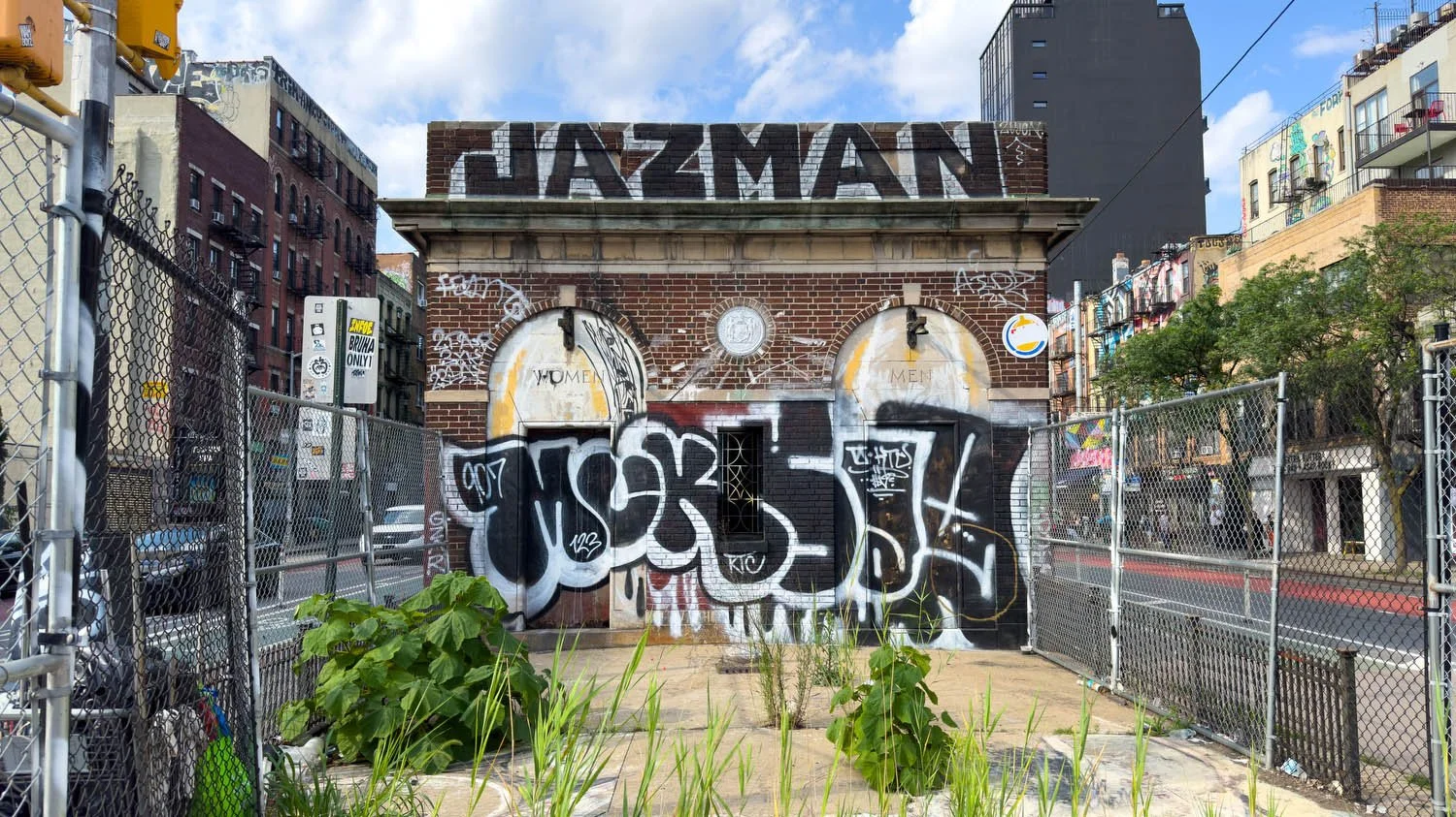 If you look through all the graffiti, you can still see “Men” and “Women” stamped out over the separate doors.