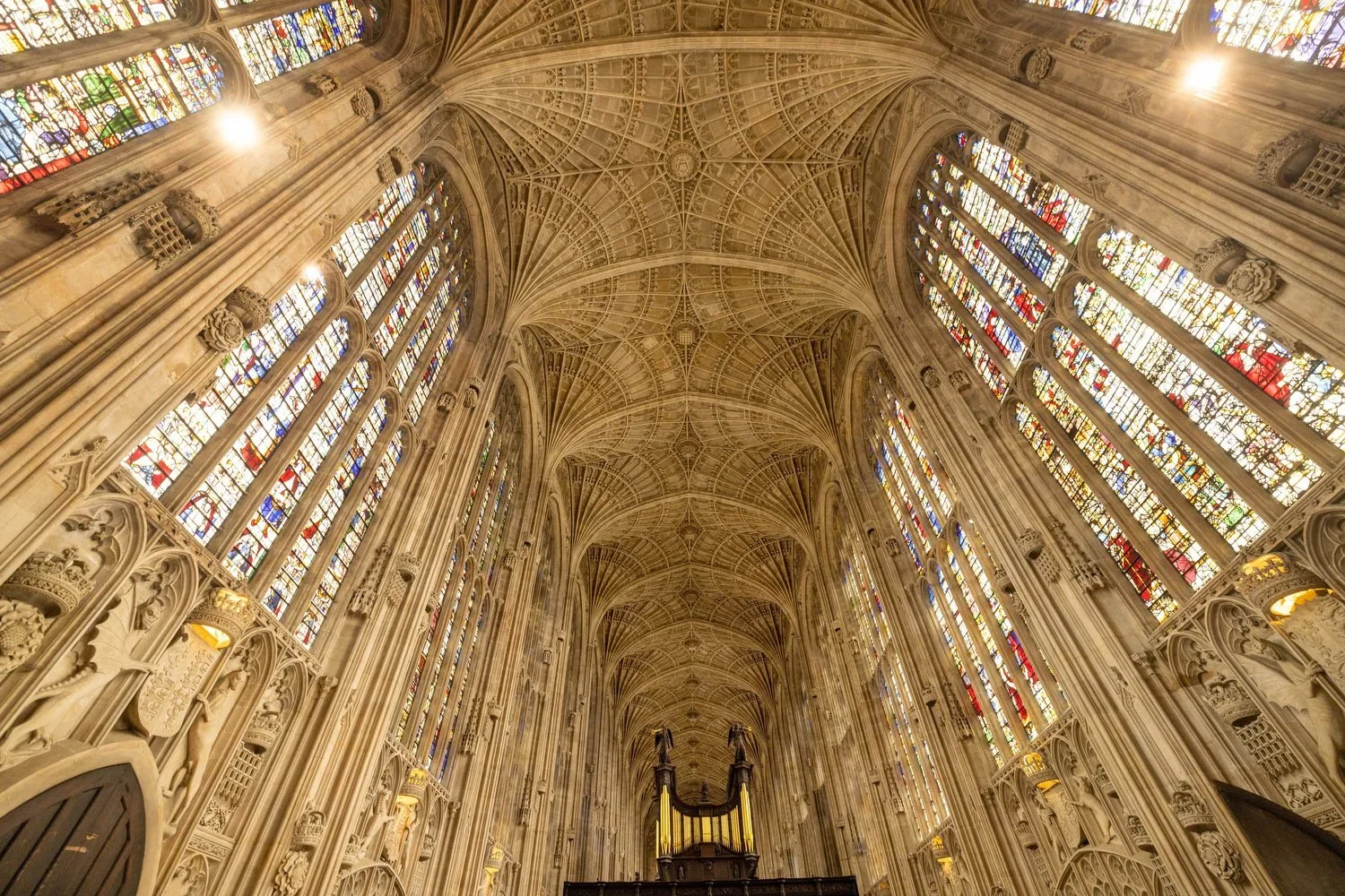 The amazing ceiling at King's College Chapel in Cambridge, just one example of Cambridge’s stunning indoor architecture.