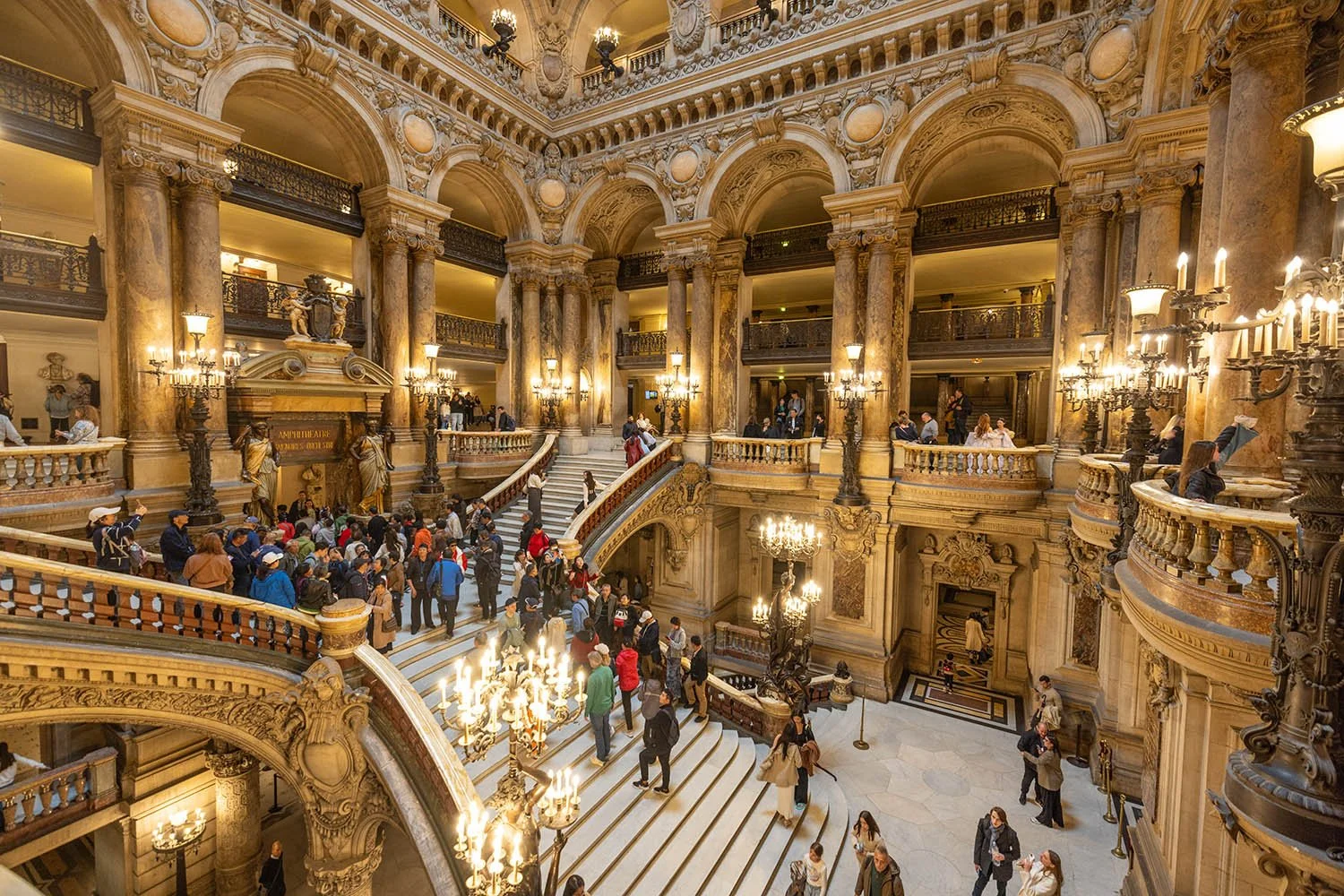 The main attraction is the marble staircase of the Grand Escalier, with its thirty-meter-high vaulted ceiling and myriad colors of exquisite marble. It branches into a double staircase leading to the various foyers, rooms and the theater.